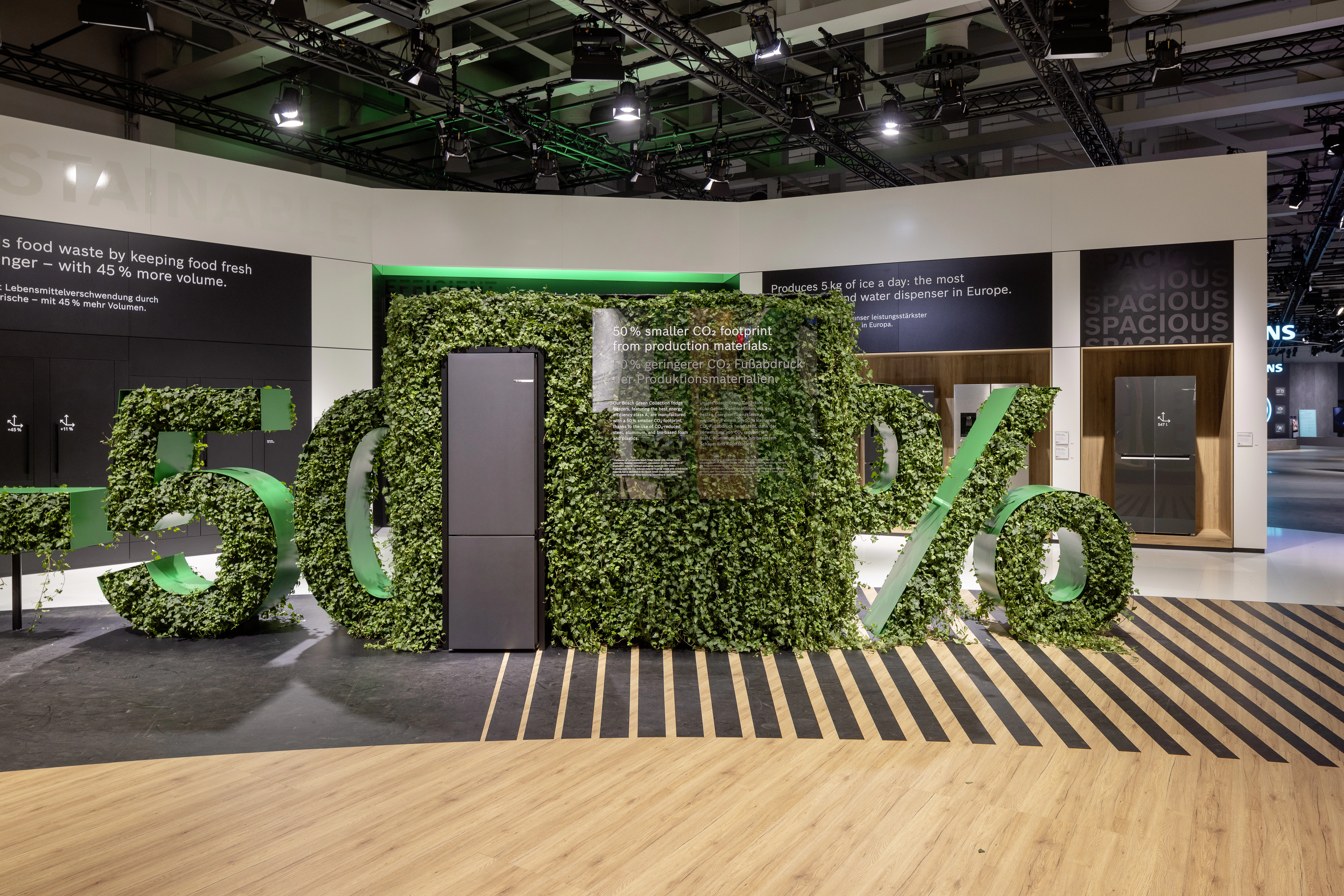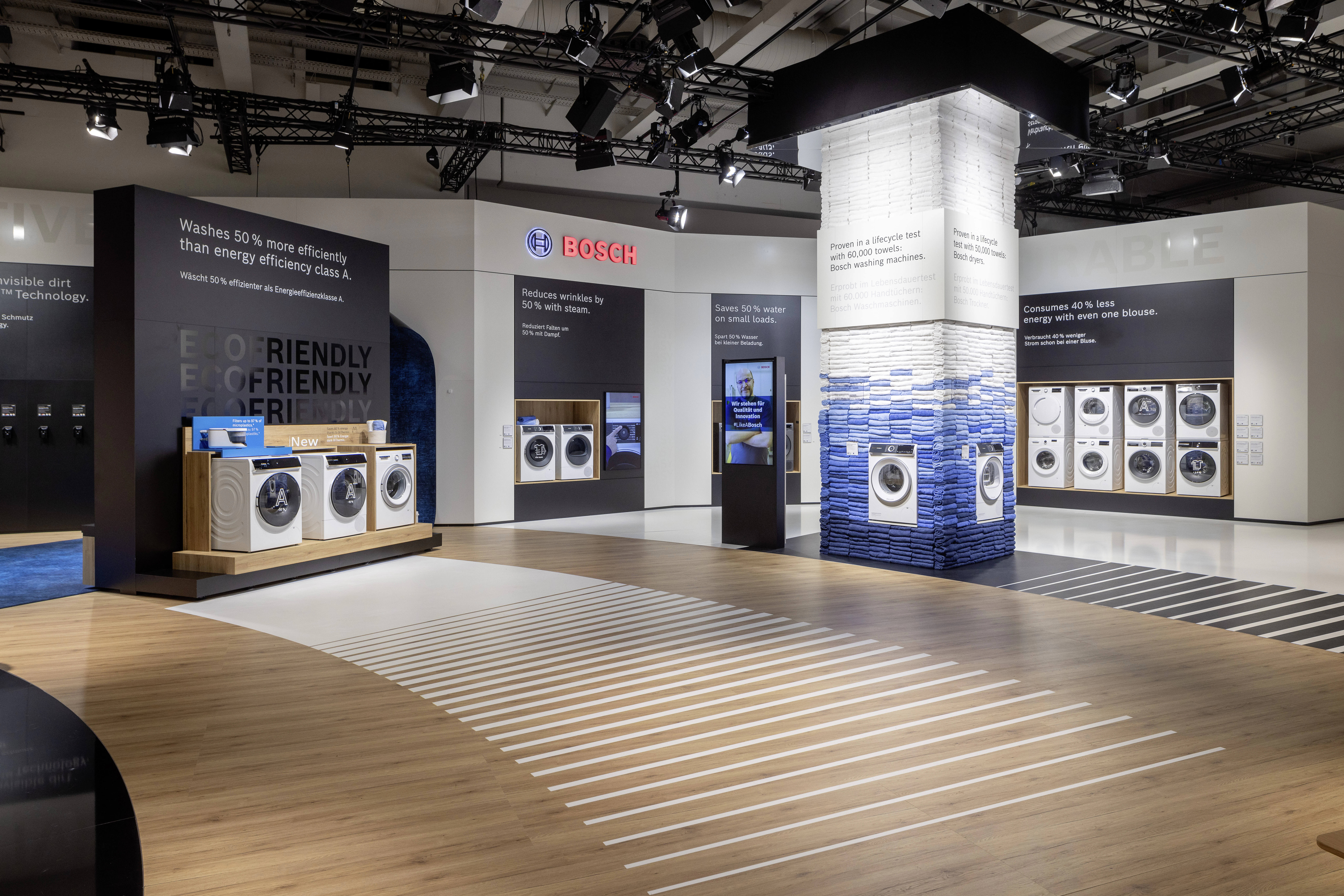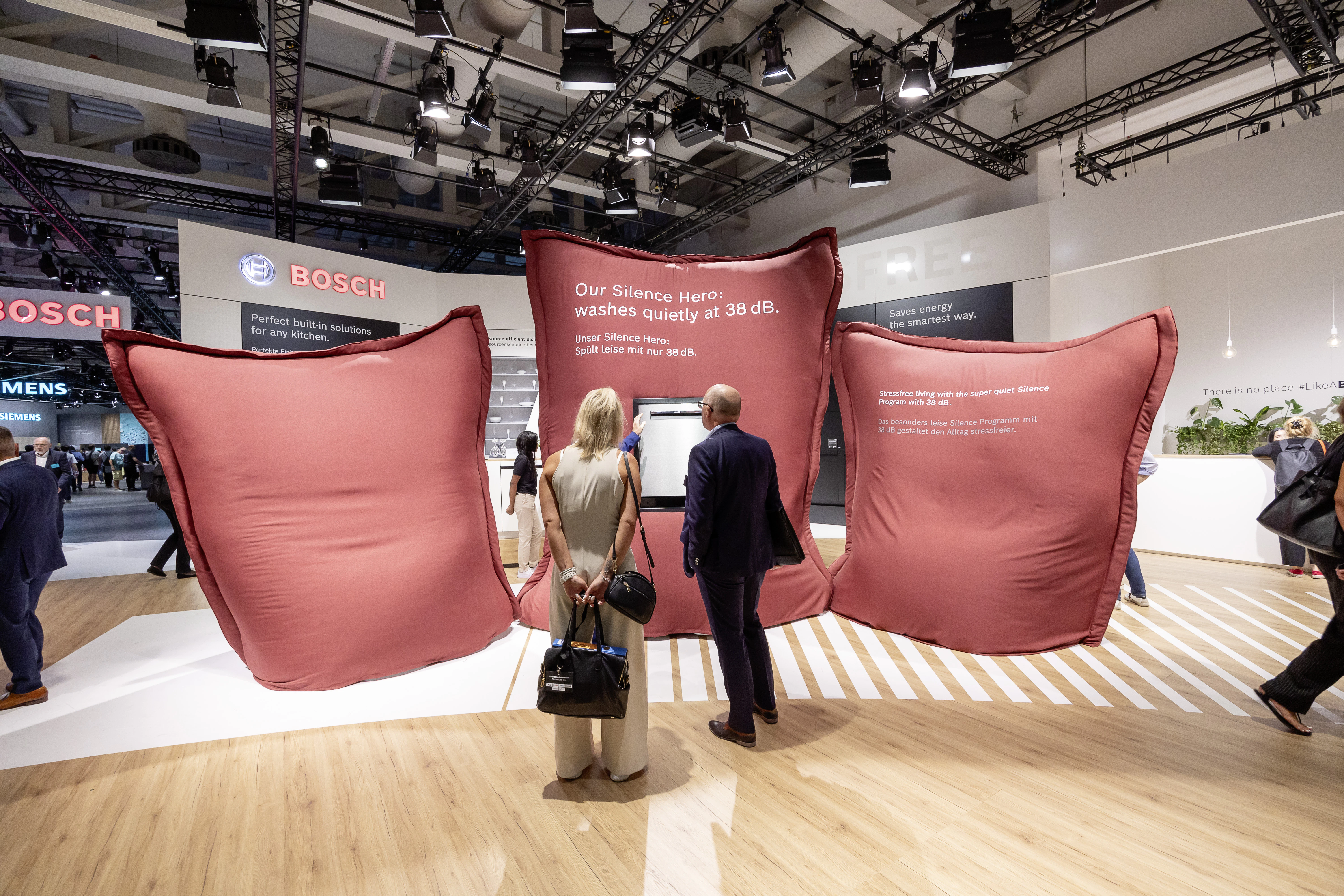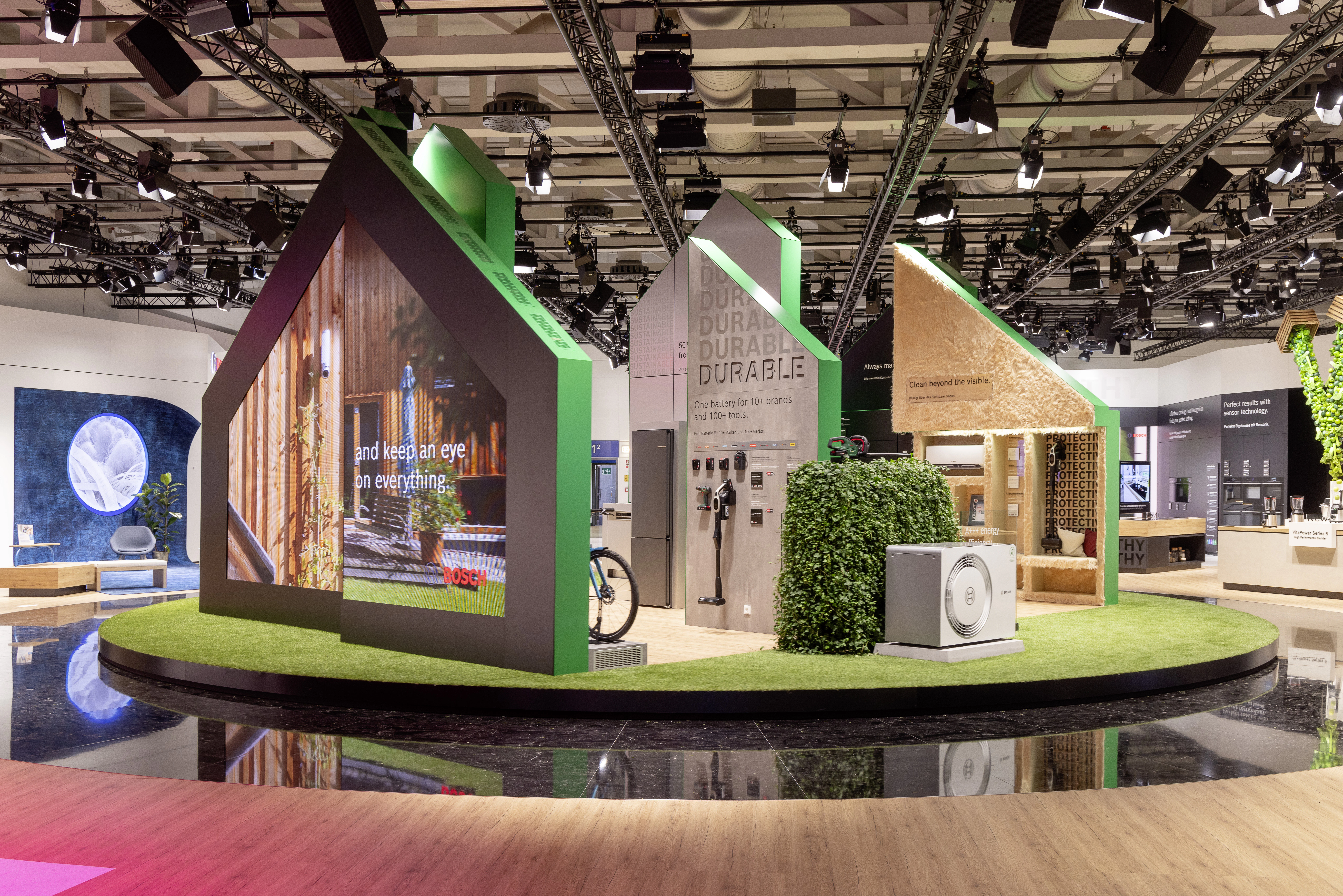 The centerpiece of the booth is the home, which rotates to open up on all sides. This home offers a spectacular 360-degree journey, allowing visitors to experience the products across five meta-levels.